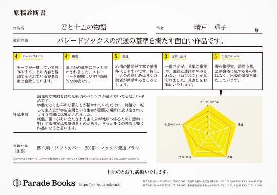 今回の特集は、12月末よりスタートしているパレードブックスの新キャンペーン、「原稿診断¥0フェア」について。原稿をお送りいただければ、心をこめて感想やアドバイスをご案内いたします!今まで出版を迷われていた方も、ぜひこの機会に原稿をお送りくださいね。