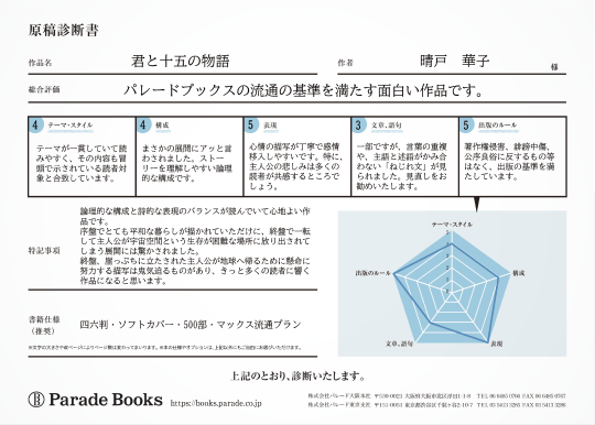 出版企画書は商業的な判断のために作成しますので、「世間の評価」や「売れる」といったことを目指していない場合は、出版企画書を作る必要はありません。また、自分自身で「出版企画書」を作るのが難しいという方は、まずは現在パレードブックスで開催中の「原稿診断¥0フェア」にご応募ください。原稿の傾向やアドバイスを添えた診断書をお返しします。ご希望の方には「出版企画書」のテンプレートもプレゼント!お申込みの際、備考欄に「出版企画書テンプレート希望」とお書きください。
